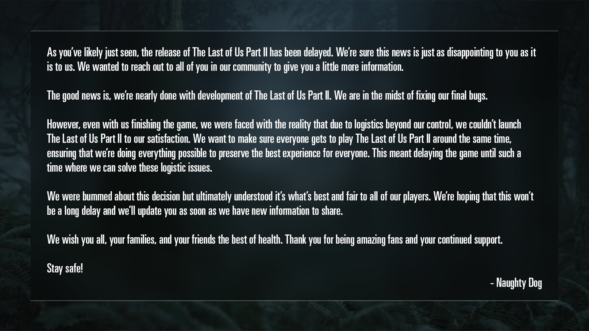 - 『The Last of Us Part II』発売日の延期が決定されました。